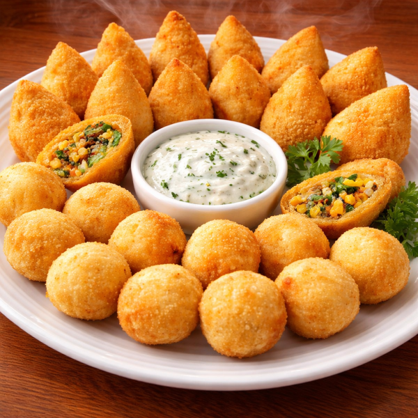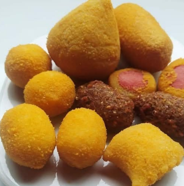 10 coxinhas, 5 bolinhas de calabresa, 5 balãozinhos de azeitona, queijo e milho