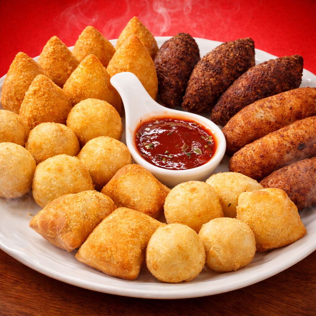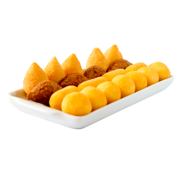 20 coxinhas, 10 bolinhas de queijo e fiambre, 10 croquetes de frango e 10