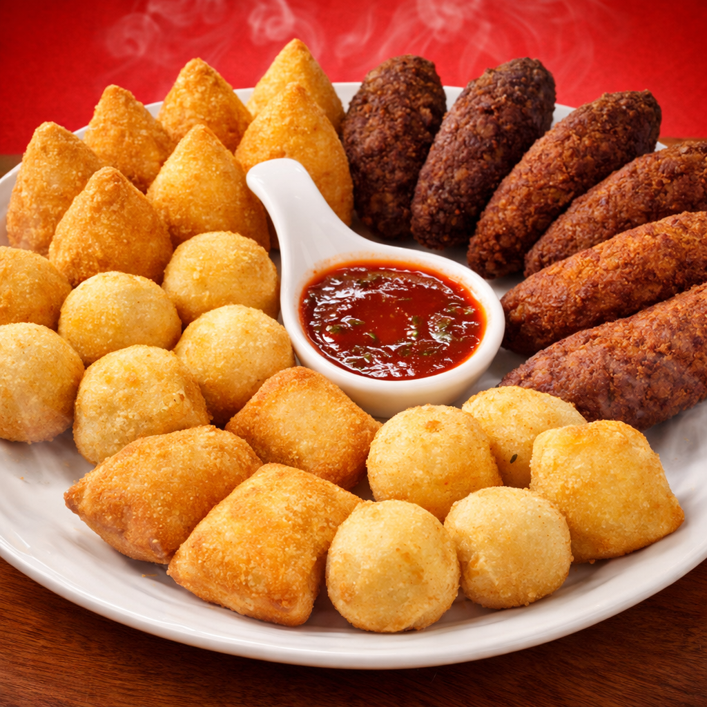 10 coxinhas, 5 croquetes de carne, 5 travesseiros de carne e 5 bolinhas de